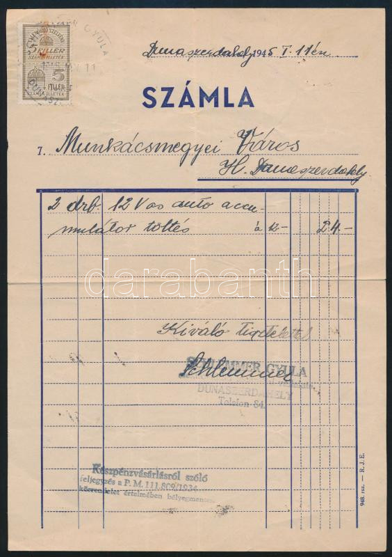 1945 Dunaszerdahelyi számla 5f számlailleték párral https://www.darabanth.com/hu/430-Gyorsarveres/430.0/Magyar-filatelia-es-postatortenet/Okmanybelyegek~500019/1945-Dunaszerdahelyi-szamla-5f-szamlailletek-parral~II2765615