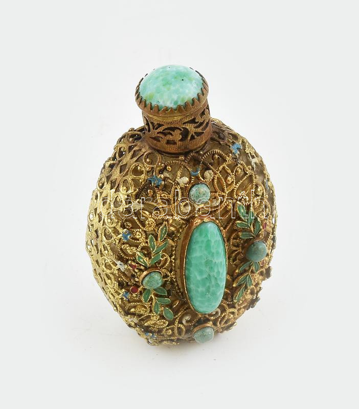 Leírás: Parfümös üvegcse, aventurin köves, áttört réz borítással, jelzett, m: 6 cm