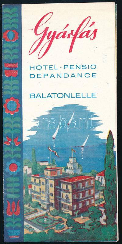 Leírás: cca 1930 A Balatonlellei Gyárfás szálloda képekkel és rajzokkal gazdagon illusztrált német nyelvű leporello reklám nyomtatványa