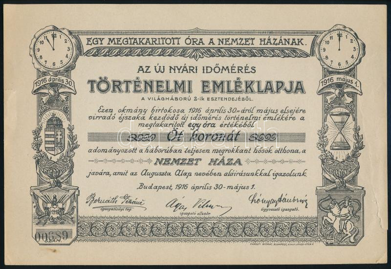 1916 Egy megtakarított óra a nemzet házának. Az új nyári időmérés történelmi emléklapja a világháború 2-ik esztendejéből. Emléklap a háborúban teljesen megrokkant hősök otthona, a Nemzet háza javára adományozott öt koronáról. Lapszéli szakadással, ragasztott, 26x17,5 cm