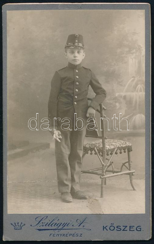 cca 1915 Katonanövendék portréja, vintage keményhátú fotó Szilágyi Arthur (Kőszeg) fényképészeti és festészeti műterméből, dekoratív szecessziós hátlappal, 11x7 cm