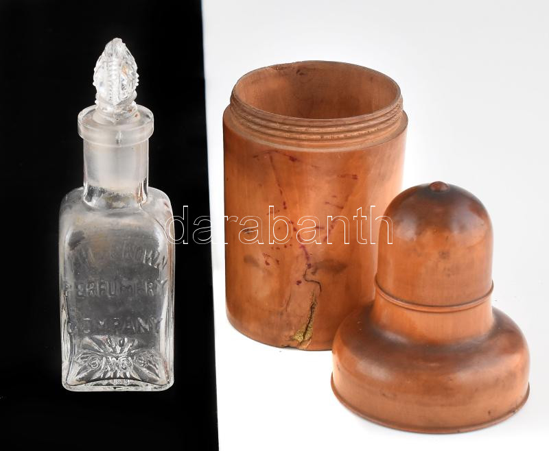 Leírás: Antik angol parfümös üveg "The Crown perfumery London" felirattal, 10 cm, fa védő tokkal 13 cm