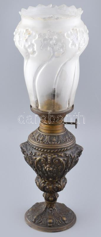 Leírás: Ditmar Wien jelzett: petróleum lámpa, Bécs, historizáló, relief szerű puttós motívumokkal, öntött, patinázott bronz, üveg búrával, búra sérült. m: 51,5 cm
