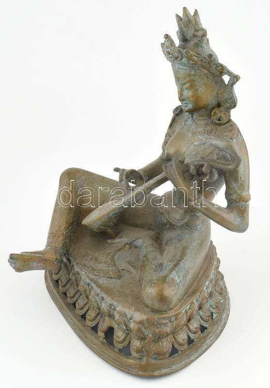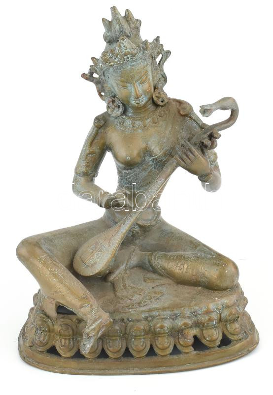 Leírás: Jelzés nélkül: Szaraszvati a tudás hindu istennője. Öntött, patinázott bronz. m: 34 cm