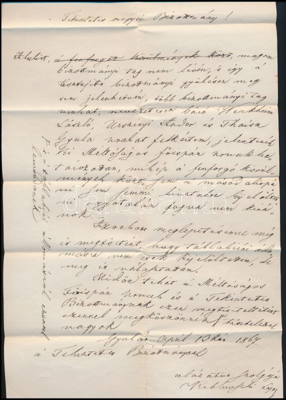 1867 Gyula, Keblovszki Lajos a megyei bizottmánynak címzett levele, melyben lemond a táblabírói állásról, amelyre a tisztújító bizottmányi gyűlés megválasztotta (a gyűlésen ő maga nem lehetett jelen, ezért báró Wenckheim László, Urszinyi Andor és Thaisz Gyula bizottmányi tagokat kérte meg, hogy képviseljék, azonban kívánsága ellenére mégis megválasztották). Egy kézzel írt oldal.