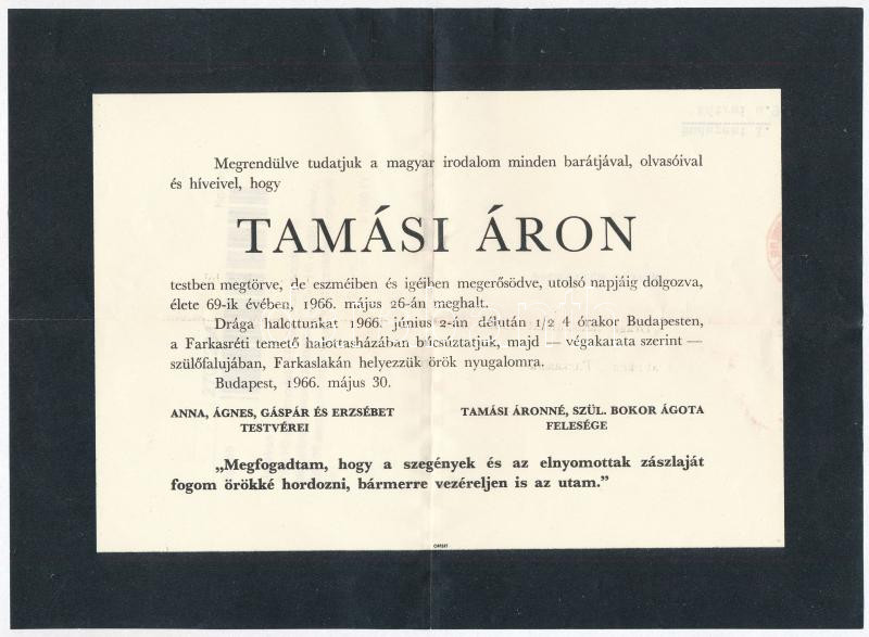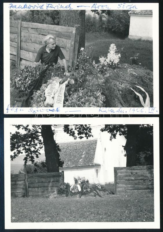 1966 Tamási Áron (1897-1966) Kossuth-díjas erdélyi magyar író halotti értesítője + 2 db fotó sírjáról szülőhelyén, Farkaslakán, az egyiken Tompa Kálmán orvos saját kezű soraival, 10,5x7,5 cm