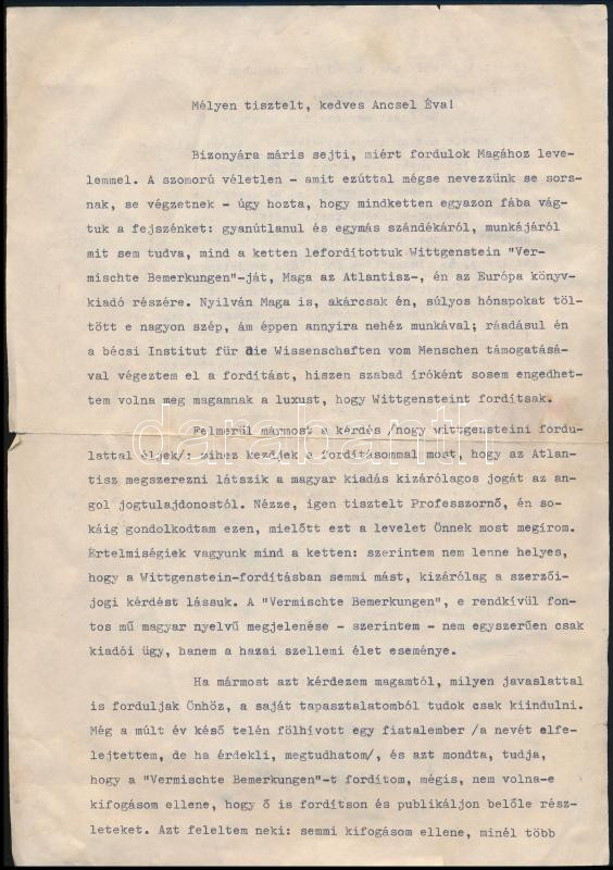 1992.III.28, Bécs, Kertész Imre (1929-2016) Nobel- és Kossuth-díjas magyar író levele Ancsel Éva (1927-1993) magyar filozófus, költőnőhöz, Wittgenstein "Vermischte Bemerkungen" fordításának ügyében, amelyen mindketten egymástól függetlenül dolgoztak. Közel két gépelt oldal, Kertész Imre autográf aláírásával, hajtásnyommal, apró lapszéli szakadással.