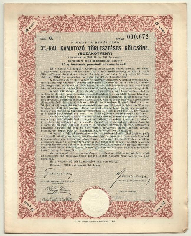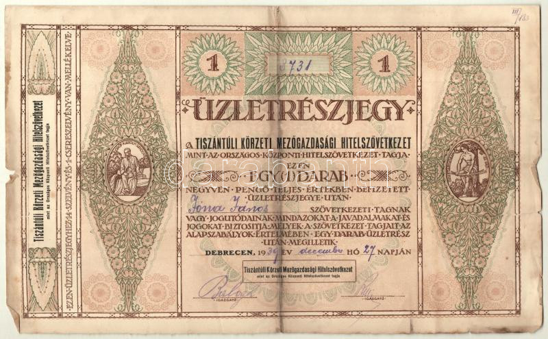Debrecen 1939. "Tiszántúli Körzeti Mezőgazdasági Hitelszövetkezet" kitöltött üzletrészjegye + Budapest 1942. "A Magyar Királyság 3%-kal Kamatozó Törlesztéses Kölcsöne (búzakötvény)" 5q búza értékéről szelvényekkel T:III,III-