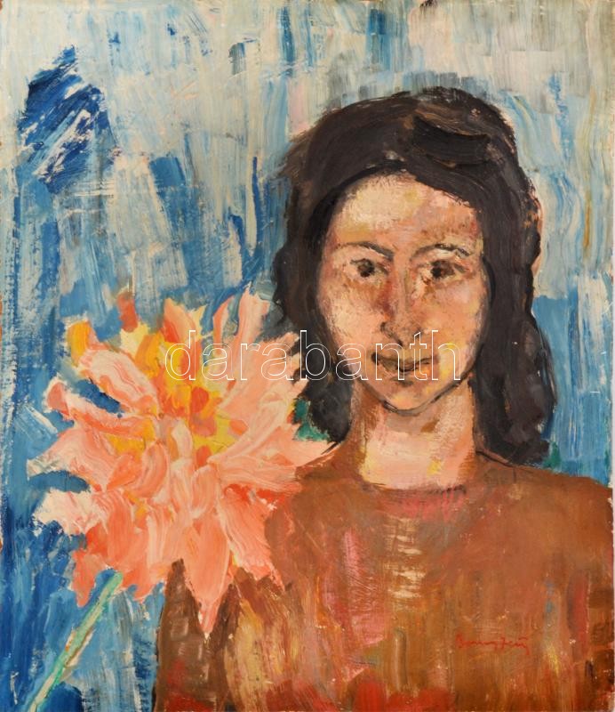 Leírás: Barcsay Jenő jelzéssel: Lány virággal. Olaj, farost. 73x61 cm.