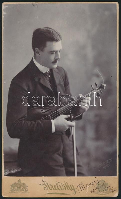 1900 Zöldi Márton cigány hegedűművész, főhadnagy, keményhátú kabinetfotó Strelisky cs. és kir. udv. fényképész budapesti műterméből, feliratozott, 21,5x13 cm
