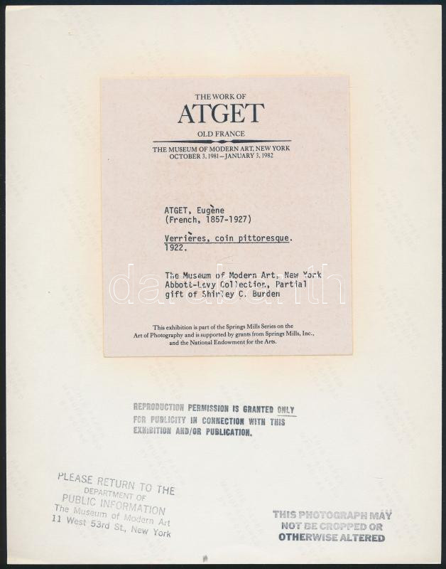 Leírás: Eugene Atget (1857-1927): Verrieres, coin pittoresque, fotóreprodukció, hátoldalon feliratozva, 25,5×20,5 cm