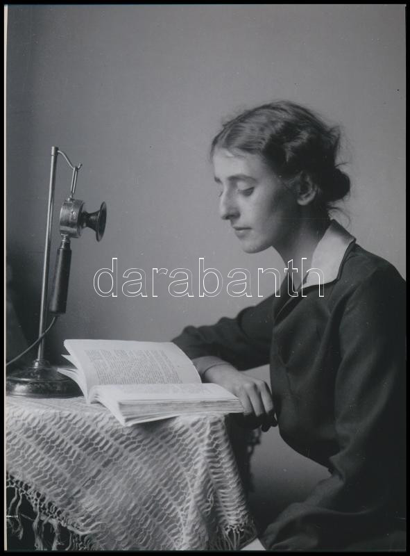 Leírás: cca 1924 Kerny Gizella fontos hívást vár, 1 db mai nagyítás Kerny István (1879-1963) budapesti fotóművész hagyatékából, 24x17,7 cm