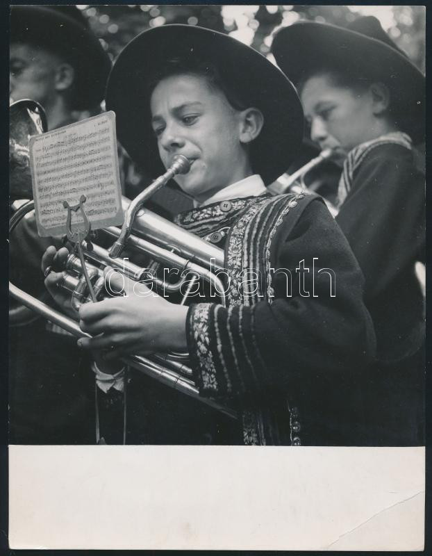 cca 1960 A kis trombitás, Photo Feher, pecséttel jelzett, feliratozott... https://www.darabanth.com/hu/431-Gyorsarveres/431.0/Fotomuveszet/Foto~5000024/cca-1960-A-kis-trombitas-Photo-Feher-pecsettel-jelzett-feliratozott-foto-sarkan-toresnyom-~II2767347