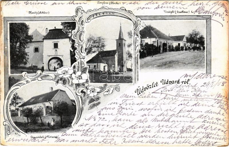 1905 Sopronudvard, Udvard, Grossmutschen, Großmutschen; Kastély, Templom, Vendéglő, Jegyzői lak / Schloss, Kirche, Gasthaus, Notariat / castle, church, restaurant, inn, notary's house. Art Nouveau, floral (EK)