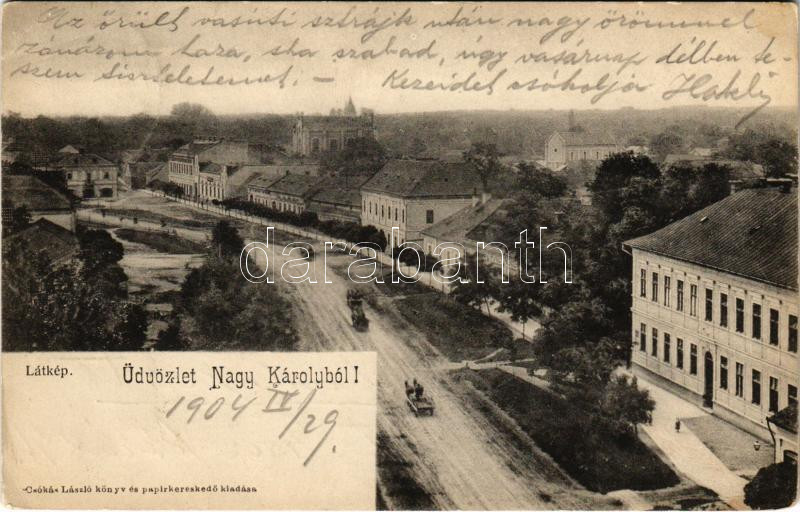 1904 Nagykároly, Carei; látkép, zsinagóga. Csókás László kiadása / general view with synagogue + "KŐRÖSMEZŐ - BUDAPEST 299. SZ. B" vasúti mozgóposta bélyegző (fl)
