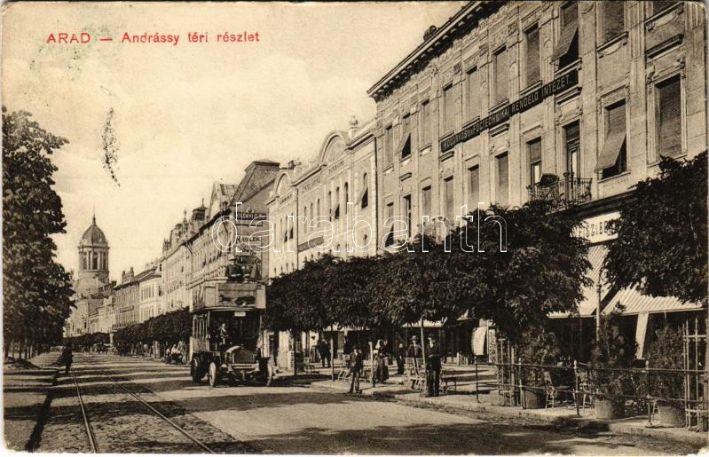 1914 Arad, Andrássy tér, emeletes busz, Fogorvosi és fogtechnikai rendelő intézet, Weisz B., Lengyel Lőrinc bútorgyár, Kilényi, Weinberger János és Nádler Lajos reklámja / square, double-decker autobus, dentistry, shops, advertising posters (EK)