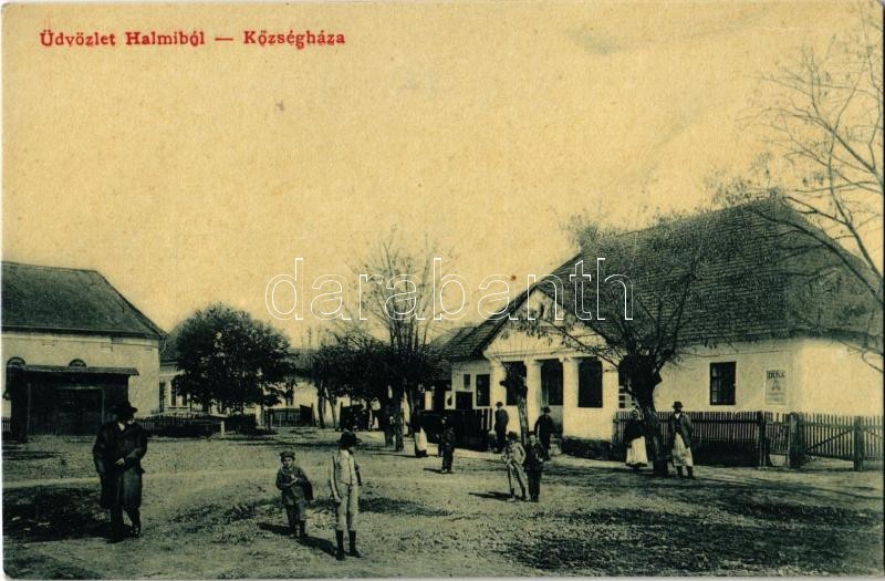 Leírás: Halmi, Halmeu; Községháza, "Duna" Biztosító Társaság ügynöksége. W. L. 1696. / town hall, insurance company