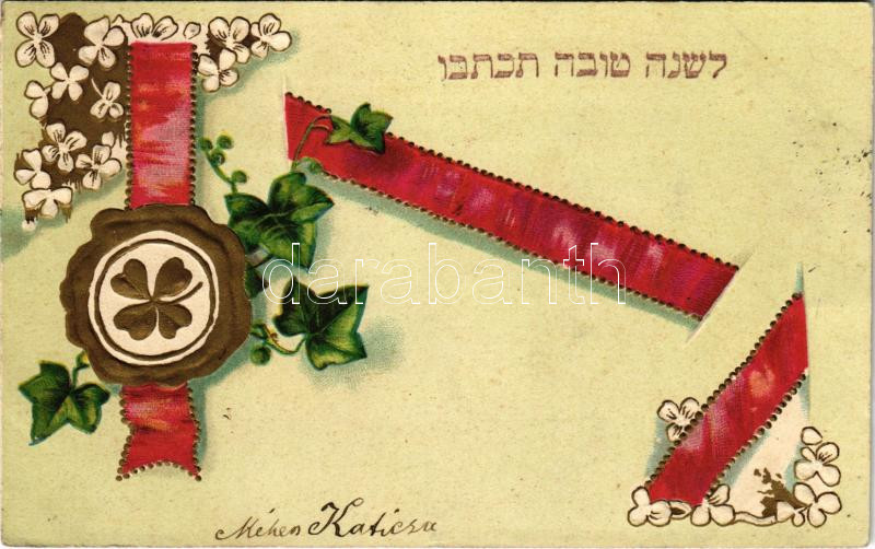 1902 Boldog Újévet! Héber nyelvű zsidó újévi üdvözlőlap. Judaika / Jewish New Year greeting art postcard with Hebrew text, Judaica. Floral, Emb. litho (EK)
