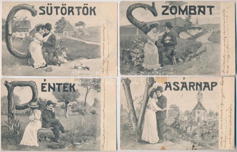 1904 A hét napjai - 7 darabos teljes bécsi romantikus képeslapsorozat, jó állapotban / Days of the Week - complete, 7-part Wiener romantic postcard series in good condition. B. K. W. I. 580/1-7. s: Th. Bauer