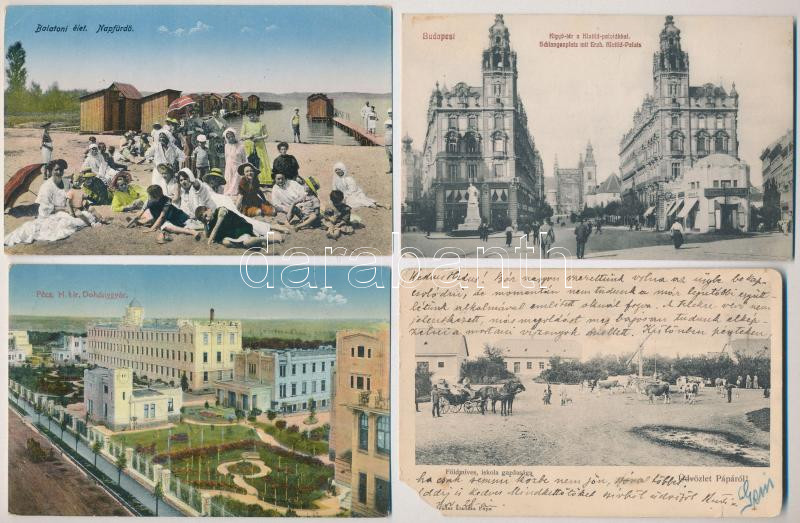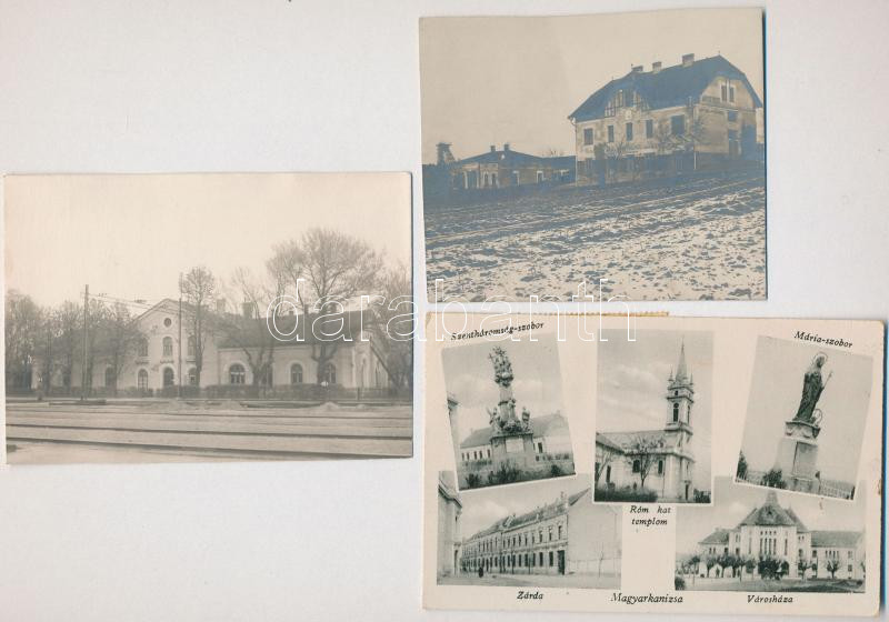 5 db RÉGI magyar város képeslap vegyes minőségben + 2 fotó vasútállomásról és gyógyszertárról / 5 pre-1945 Hungarian town-view postcards in mixed quality + 2 photos of railway station and pharmacy