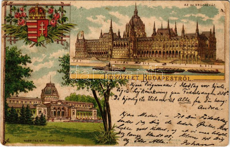 Leírás: 1896 (Vorläufer!) Budapest, Margitszigeti fürdőház, új országház. Magyar címer, Art Nouveau, floral, litho (EK)
