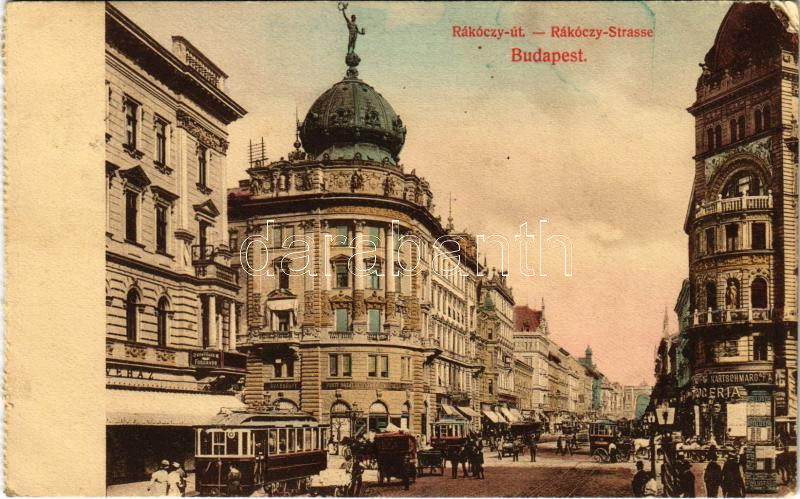 1913 Budapest VIII. Rákóczy út, Blaha Lujza tér, villamosok, Kartschmaroff A., Drogéria, kávéház, Pesti Hazai Első Takarékpénztár Egyesület, Krayer E.T. üzlete, Dr. Bonyhárd M. fogorvos (EK)