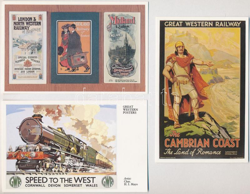 3 db MODERN 6 részes (összesen 18 db) reprint képeslap: vasúti utazások plakátok eredeti borítékokban / 18 modern reprint railway travel advertising postcards in 3 envelopes