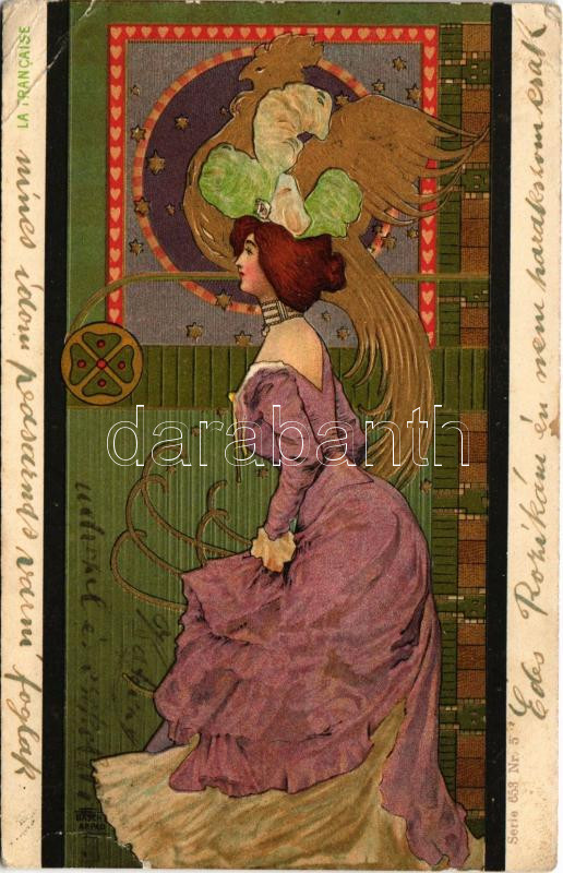 1901 La Francaise. Serie 653. Nr. 5. / Francia hölgy. Magyar dombornyomott szecessziós litho művészlap / The French lady. Hungarian Art Nouveau embossed litho s: Basch Árpád (Rb)