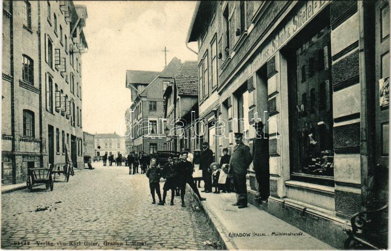 Leírás: 1905 Grabow i. Mecklenburg, Mühlenstrasse, Franz Loss Schuh & Stiefel / street and shop