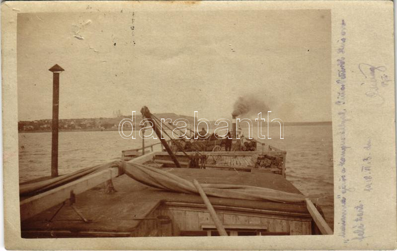 1918 Piua Petrii, "MARIANNA" csavaros vontató gőzhajó (gőzös) a kompuszállyal Harsova (?) felé tart a Dunán / screw propelled steam tug with barge in the Danube. photo (EK)