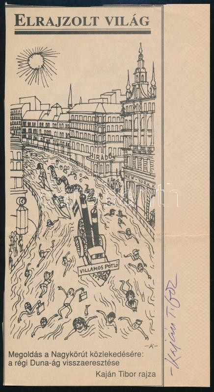Leírás: Kaján Tibor grafikus autográf aláírása karikatúráját tartalmazó kivágáson 21x12 cm