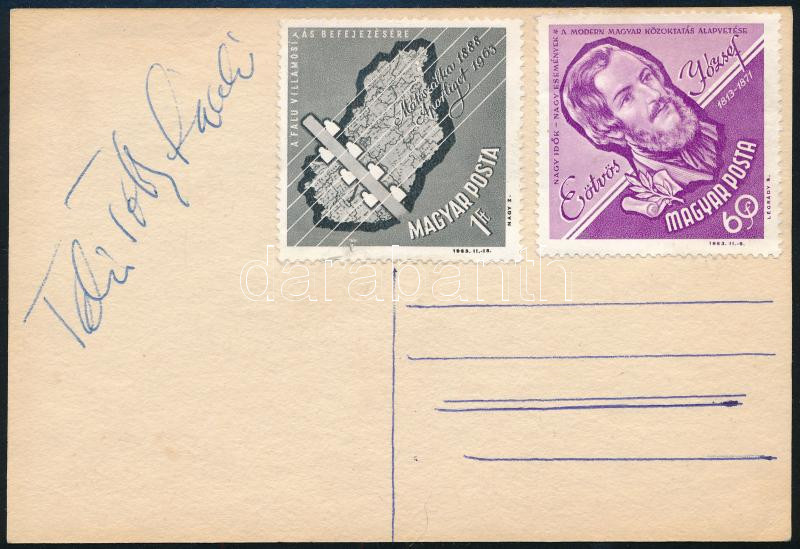 Leírás: Tahi Tóth László (1944-2018) színművész autográf aláírása levelezőlapon