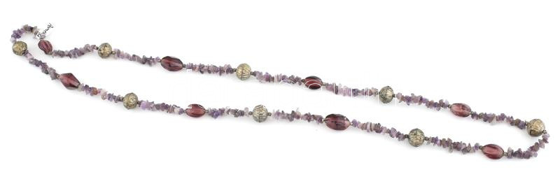 Leírás: Ametiszt nyaklánc, ezüstözött fém gyöngyökkel, h: 96cm