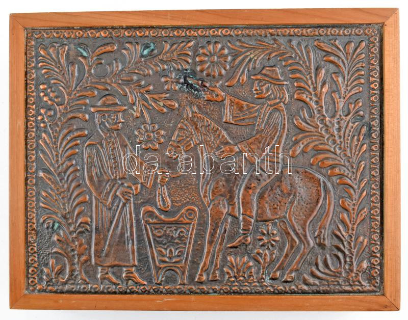 Leírás: Iparművészeti fadoboz, réz lemez díszítéssel, kopott, 22x28cm
