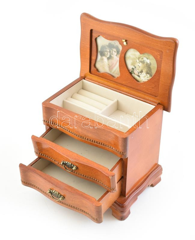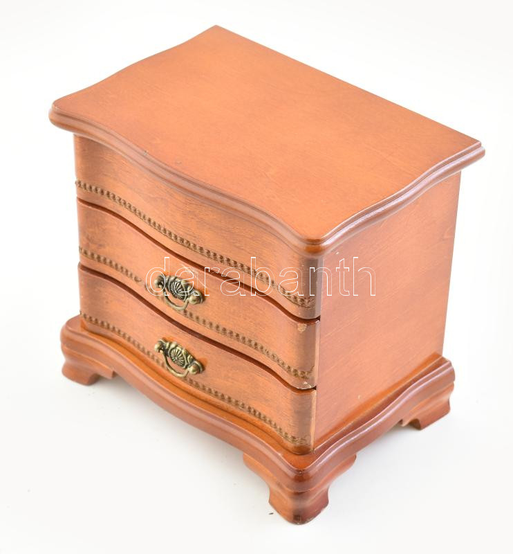 Leírás: Kis méretű ékszertartó komód, fa, 15x20x19cm