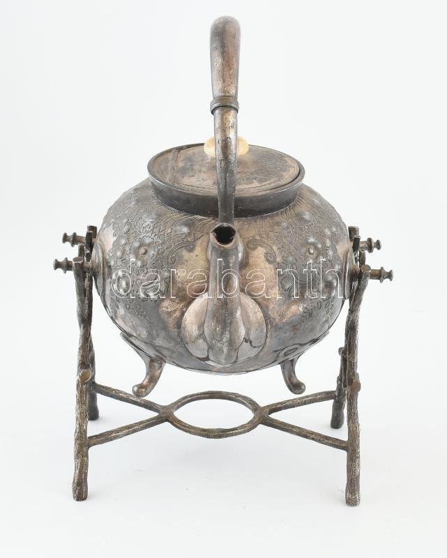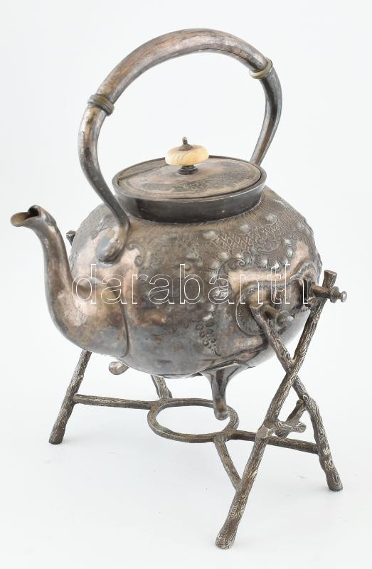 Leírás: Teáskanna állvánnyal.Mintás, alpakka. Sérült! 30 cm