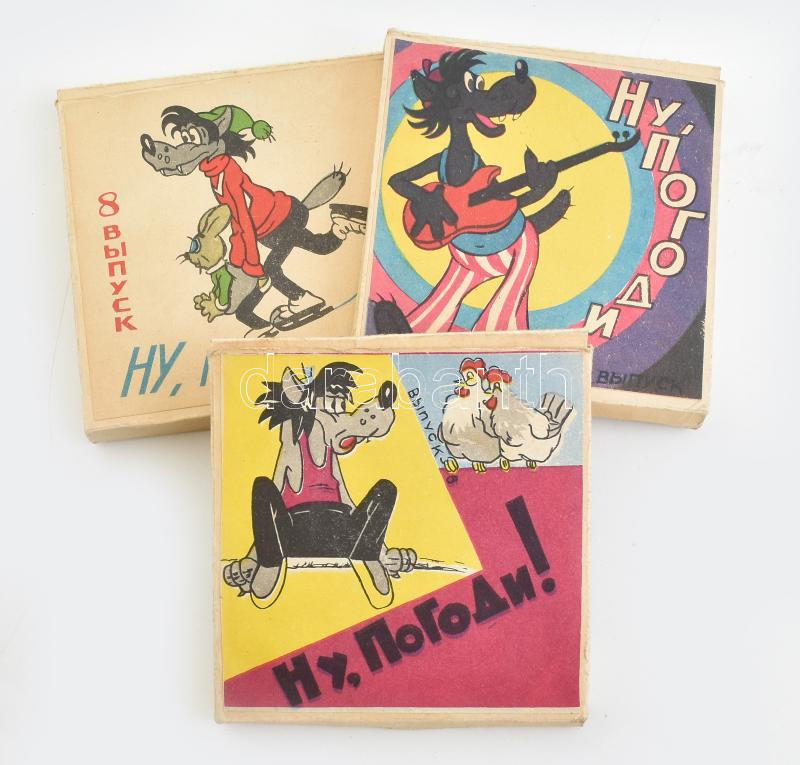 cca 1970-1980 Nu, págágyí! (No, megállj csak!) retró szovjet mesefilmek 8 mm-es filmen, 3 db különféle, eredeti dobozukban / Nu, pogodi! (Well, Just You Wait!) vintage Soviet cartoon series on 8mm film, 3 different films, in original boxes