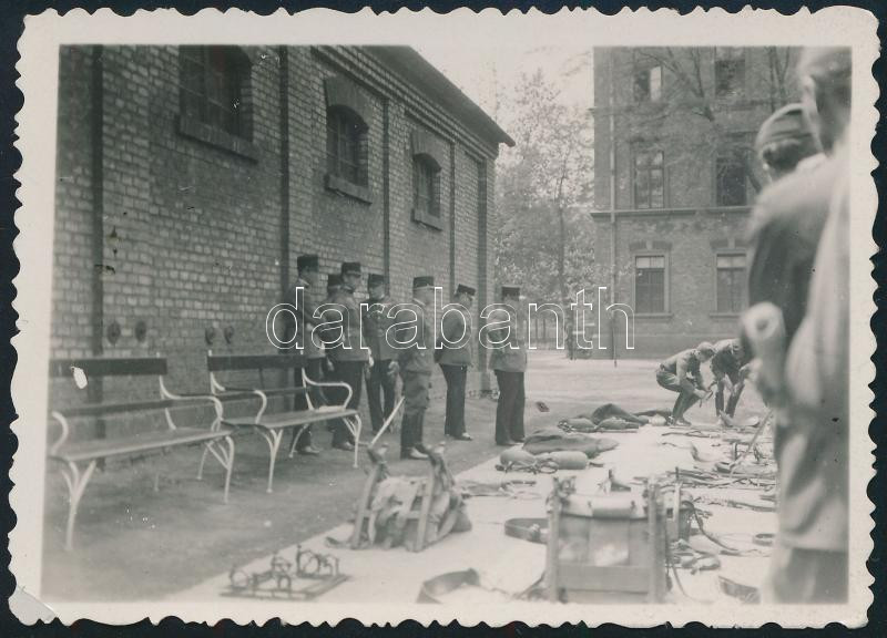 Leírás: 1934 Bp., tiszti vizsga laktanya udvarán, katonatisztek menetfelszerelésekkel, hátoldalán feliratozott fotó, 8,5x6 cm