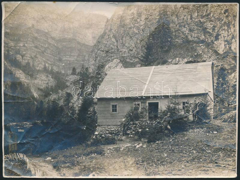 cca 1917 A cs. és kir. 105. gyalogezred (K.u.K. Infanterie-Regiment 105.) katonaotthona a Keleti-Kárpátokban (Erdély, Hagymás-hegység, Békás-szoros közelében), I. világháborús fotó, a hátoldalon feliratozott, gyűrődésekkel, 16x11,5 cm
