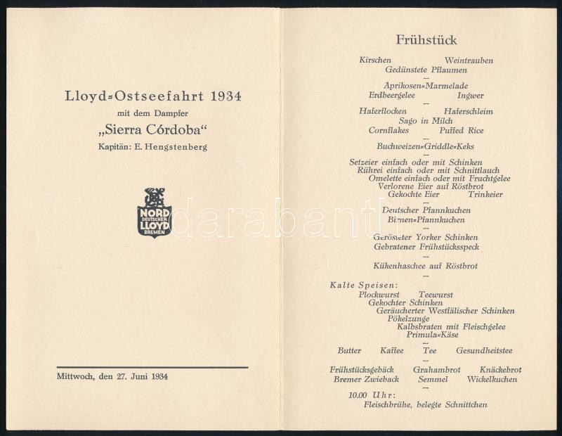 1934 SS Sierra Cordoba, Lloyd-Ostseefahrt gőzhajó reggeli menükártyája https://www.darabanth.com/hu/431-Gyorsarveres/431.0/Mutargy-papirregiseg-egyeb/Nyomtatvanyok~4000002/1934-SS-Sierra-Cordoba-Lloyd-Ostseefahrt-gozhajo-reggeli-menukartyaja~II2769489