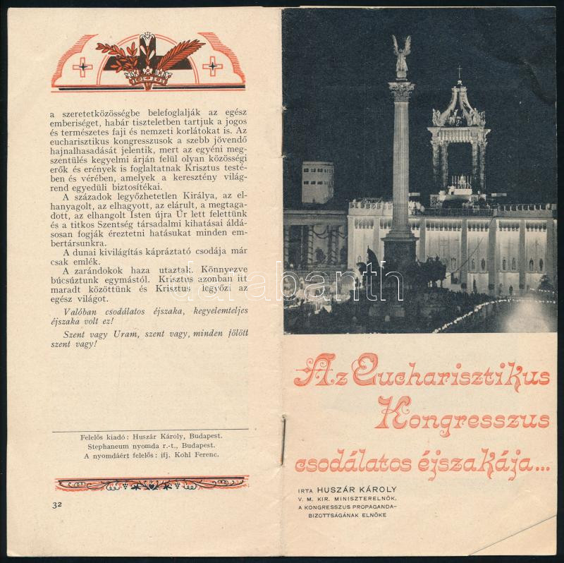 1938 Az Eucharisztikus Kongresszus csodálatos éjszakája. írta Huszár K... https://www.darabanth.com/hu/431-Gyorsarveres/431.0/Mutargy-papirregiseg-egyeb/Nyomtatvanyok~4000002/1938-Az-Eucharisztikus-Kongresszus-csodalatos-ejszakaja-irta-Huszar-Karoly-Kepes-nyomtatva~II2772316