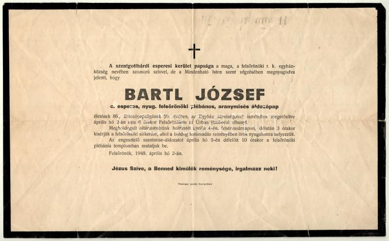 Leírás: 1948 A Vas megyei felsőrönöki plébános halálozási értesítője, gyűrődésekkel