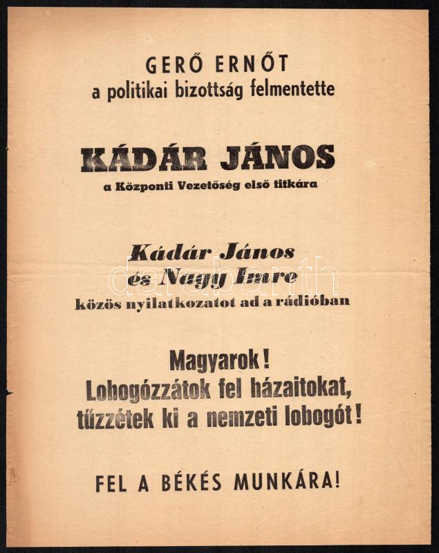 1956 "Kádár János a Központi Vezetőség első titkára" falraga... https://www.darabanth.com/hu/431-Gyorsarveres/431.0/Mutargy-papirregiseg-egyeb/Nyomtatvanyok~4000002/1956-Kadar-Janos-a-Kozponti-Vezetoseg-elso-titkara-falragasz-hajtott-29C39722-cm~II2771087