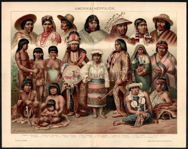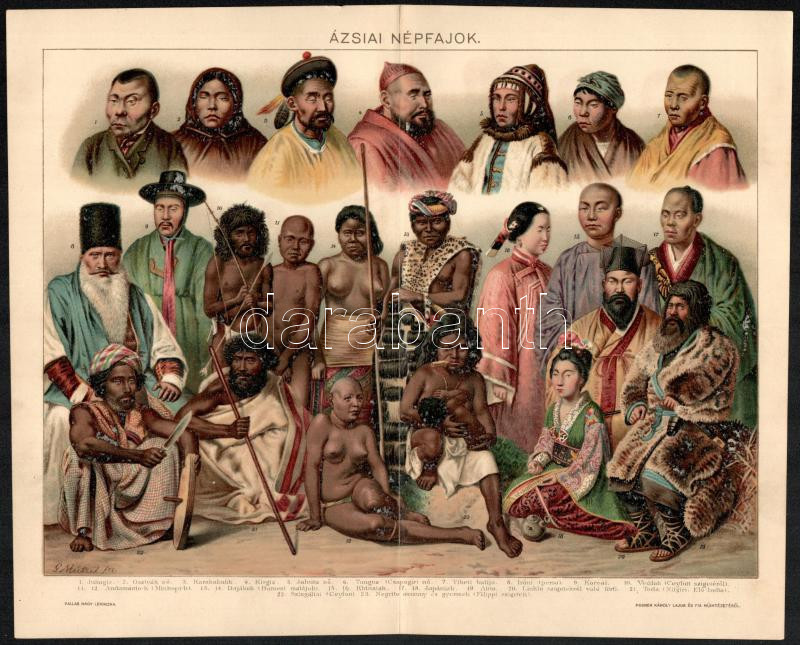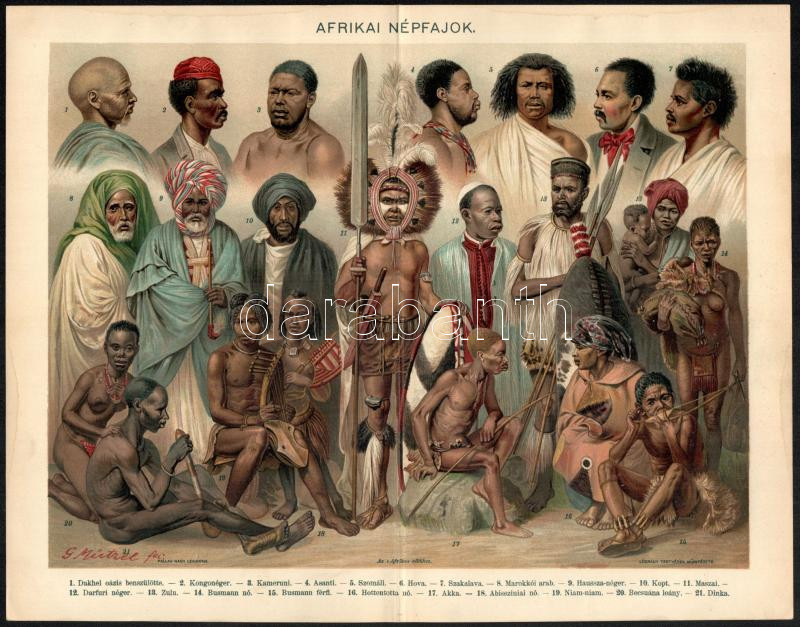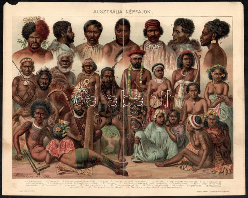 cca 1896 Népfajok (amerikai, afrikai, ausztráliai, ázsiai), 4 db nyomat, papír, Pallas Nagy Lexikona, két lap széle foltos, egy másik lap széle foltos, 24x30 cm