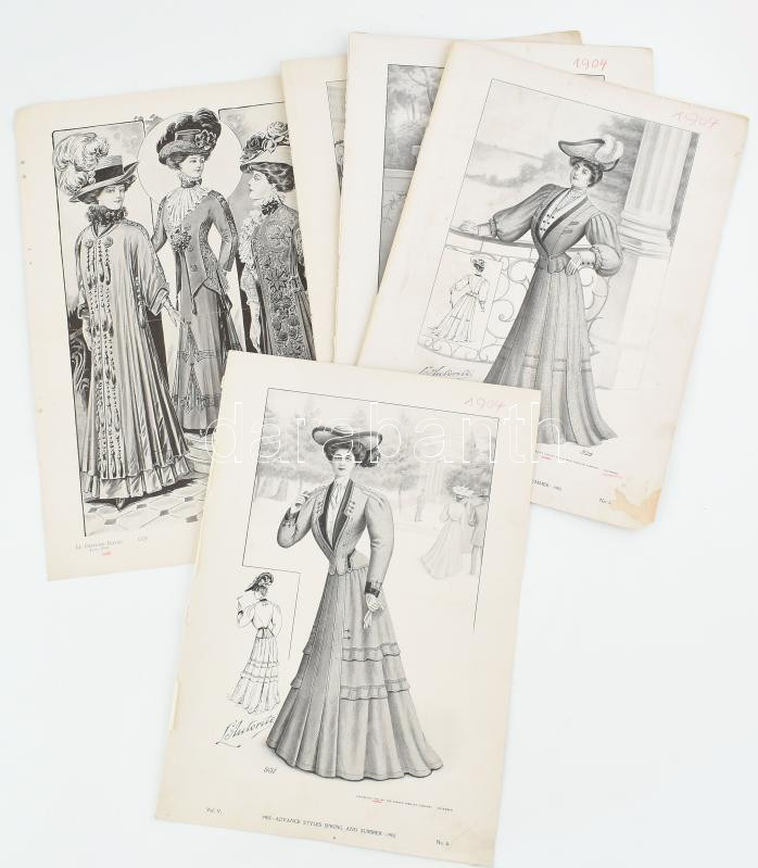 cca 1905-1908 össz. 4 lap női divatképekkel divatlapokból, részben ceruzás jelölésekkel és feliratokkal, részben sérült, 38x27 és 42x29 cm közötti méretekben
