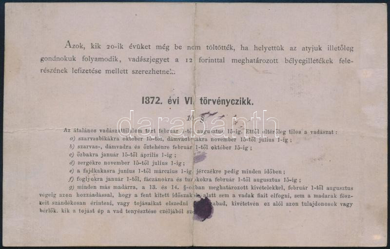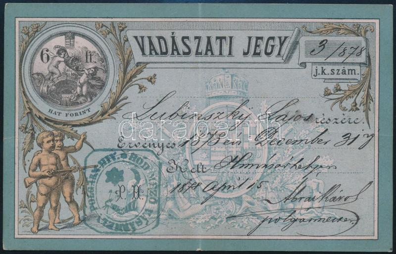 1878 Vadászati jegy Hódmezővásárhelyen kiállítva, Ábrai Károly (1830-1912), Hódmezővásárhely polgármestere autográf aláírásával. 6 Ft értékjeggyel. Hajtásnyommal, de egyébként jó állapotban. / Hunting card