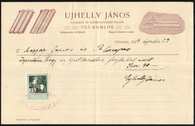 Leírás: 1914 Tót-Komlós, Ujhelly János Fatelepe és Czementcserép-Telepének fejléce számlája, 14 filléres okmánybélyeggel, Ujhelly János aláírásával.