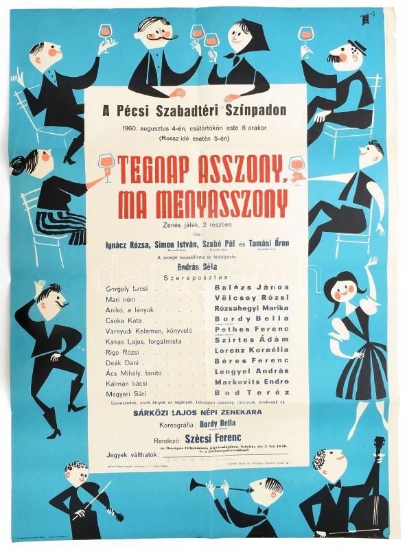 Leírás: cca 1960-1970 "Tegnap asszony, ma menyasszony" pécsi szabad színpad műsorplakátja, 69×50 cm