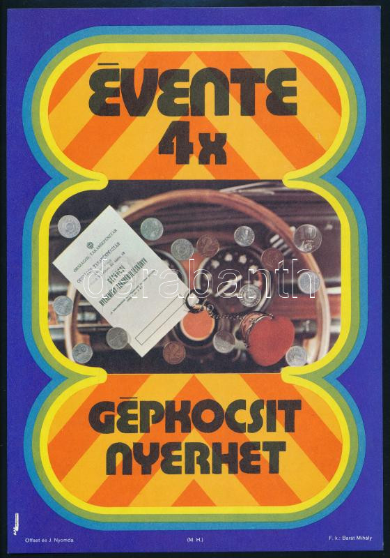 cca 1970-1980 "Évente 4x gépkocsit nyerhet", Országos Takaré... https://www.darabanth.com/hu/431-Gyorsarveres/431.0/Mutargy-papirregiseg-egyeb/Plakat~4000003/cca-1970-1980-Evente-4x-gepkocsit-nyerhet-Orszagos-Takarekpenztar-kisplakat-villamosplakC3~II2767898