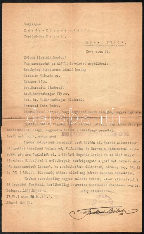 Leírás: 1928 A Munkácsy album szerkesztőbizottságának levele Kézdi-Kovács László (1864-1942) festőművész, műkritikus részére